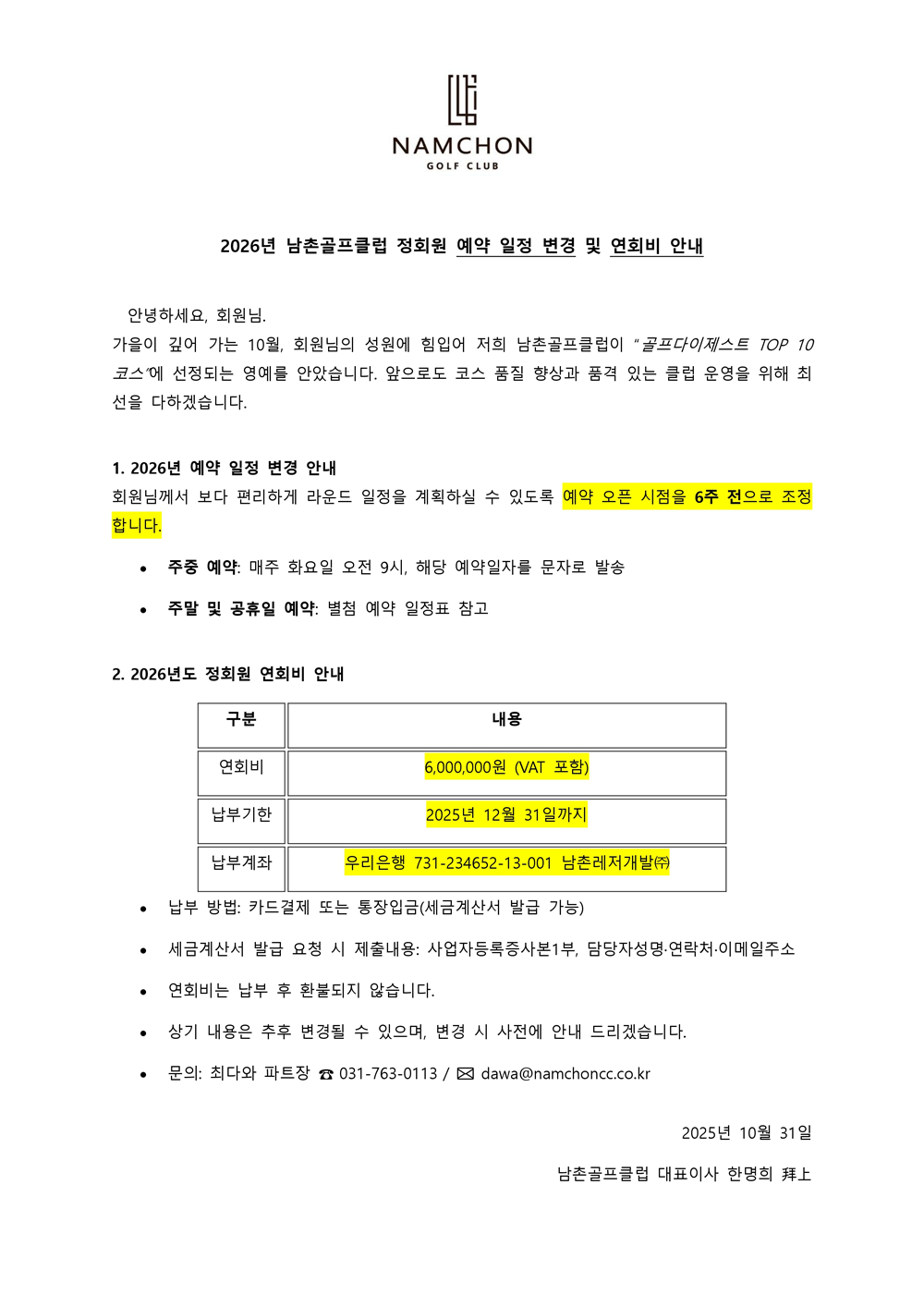 2026년 정회원권 예약일정변경 및 연회비 안내